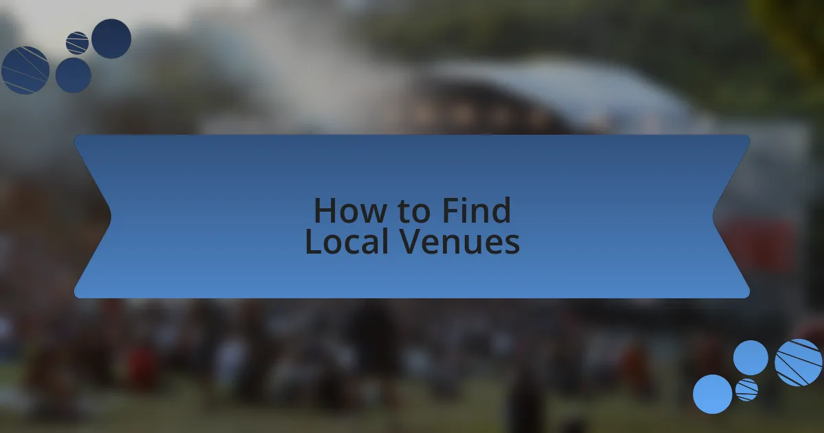 Finding local venues for your R&B gigs is often a combination of online research and community engagement. I remember scouring local music forums and social media groups—these platforms are gold mines for uncovering hidden gems. Have you ever thought about how much information is shared by like-minded artists? Networking in these spaces can often lead you to venues you might not find otherwise.